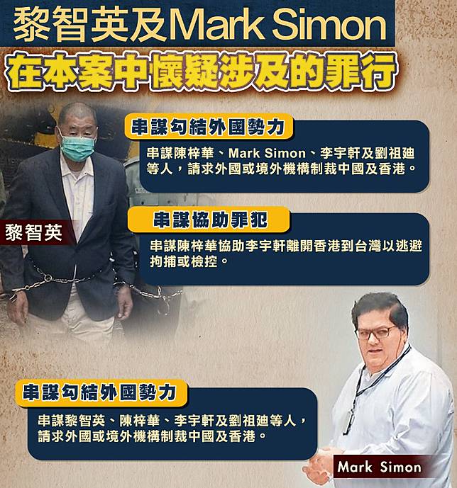 Feb 17, 2021 · 被告陳梓華(29歲)被控一項「串謀勾結外國或者境外勢力危害國家安全」及一項「串謀協助罪犯」罪。勾結外國勢力控罪指,被告於2020年7月1日至2021年2月15日間,與黎智英、mark simon、李宇軒、劉祖廸及其他人一同串謀,請求外國或境外機構、組織、人員,實施.